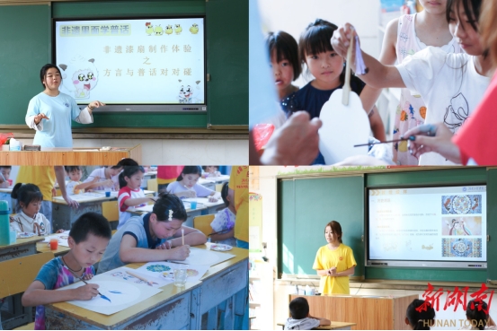 在胡桥村小学,团队成员化身“小老师”,创新采用“非遗里学普通话”教学模式。他们巧妙运用敦煌纹样、蓝印花布等非遗元素,结合非遗漆扇手工制作,将绕口令、邵阳方言转普通话等趣味环节融入课堂,极大激发了孩子们学习普通话的热情。课堂上书声琅琅,笑语不断,孩子们在动手实践中快乐学习标准发音。